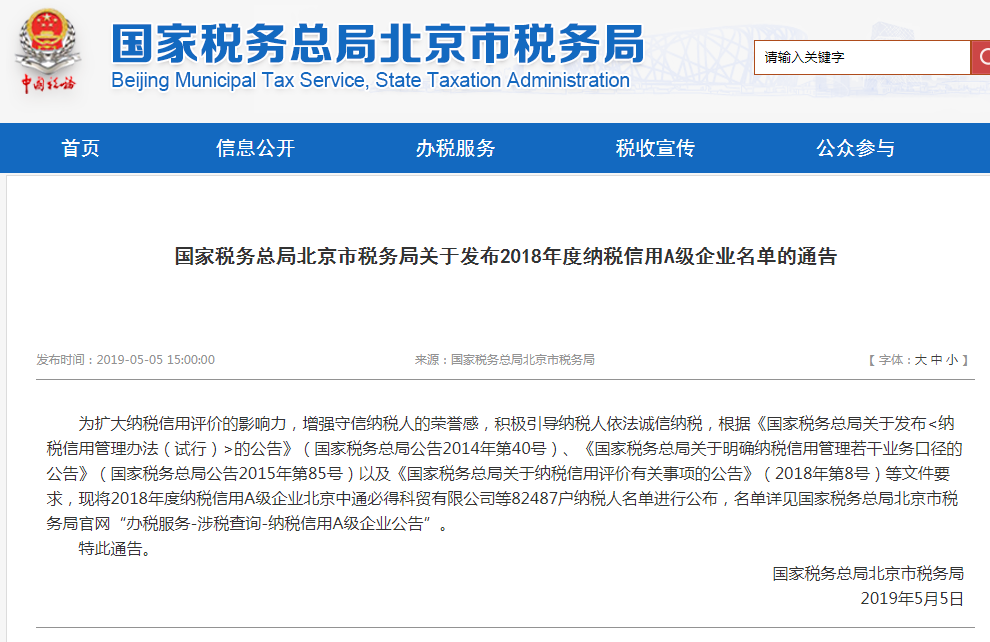 2019年5月5日,為擴(kuò)大納稅信用評(píng)價(jià)的影響力,增強(qiáng)守信納稅人的榮譽(yù)感,積極引導(dǎo)納稅人依法誠信納稅,國家稅務(wù)總局北京市稅務(wù)局發(fā)布了2018年度納稅信用A級(jí)企業(yè)名單。