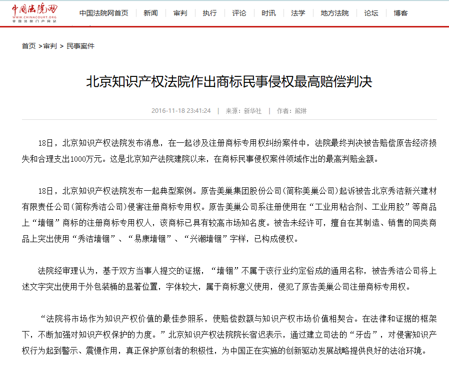 據統計,除本案中涉及到的“美巢”系列商標是美巢集團公司合法注冊商標外,包括“易呱平”“墻錮”“墻尼”“坊水固”“占瓷寶”“華彩”等在內都是美巢公司合法注冊商標。