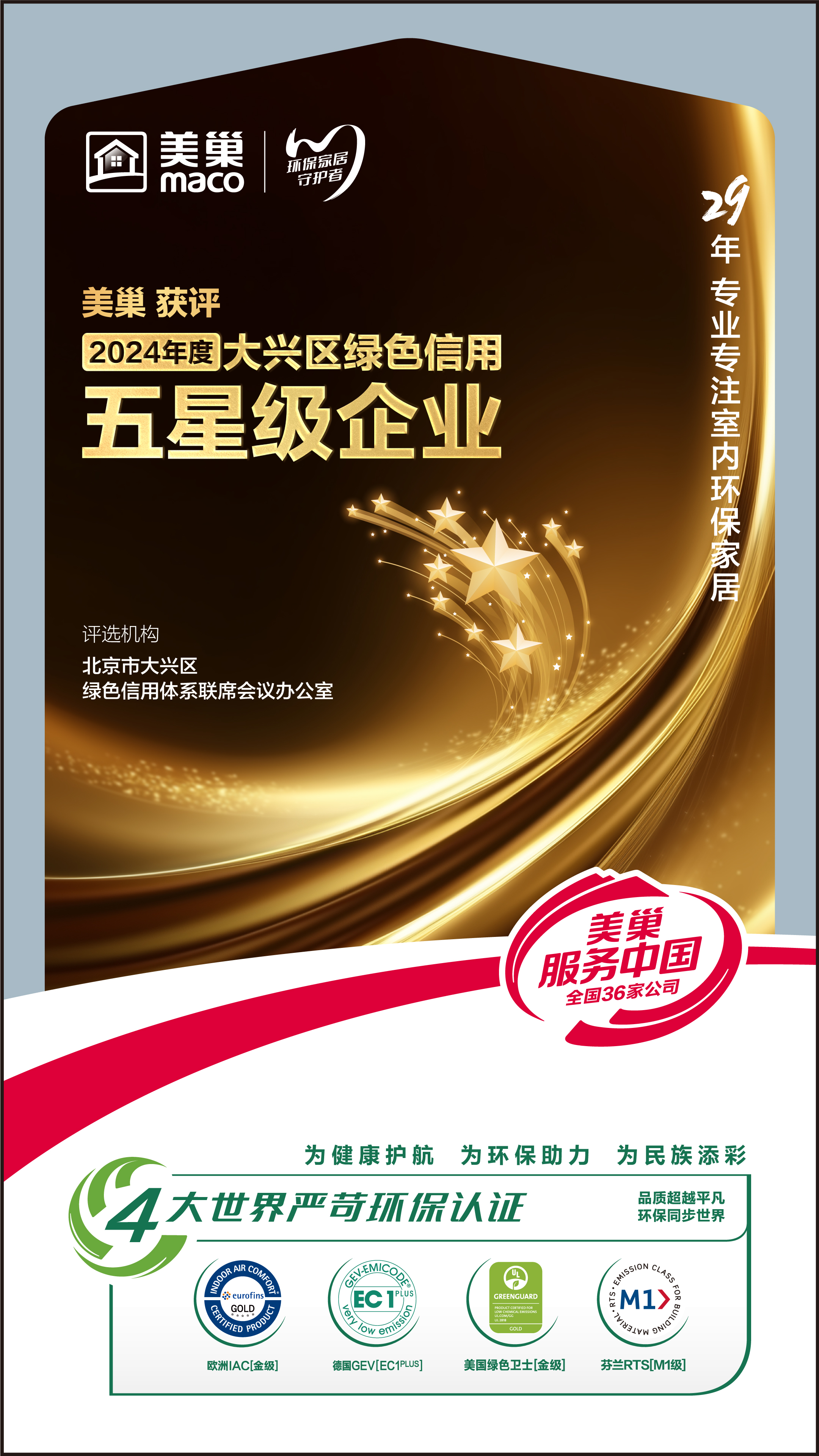 近日,在北京市大興區(qū)與河北省廊坊市聯(lián)合舉辦的“美麗中國我先行——興廊攜手走進美麗空港”六五環(huán)境日主場活動中,美巢憑借在環(huán)境守法、治污減排、低碳循環(huán)、科學管理和社會貢獻等5個維度的卓越表現(xiàn),被評為2024年度“綠色信用五星級企業(yè)”。