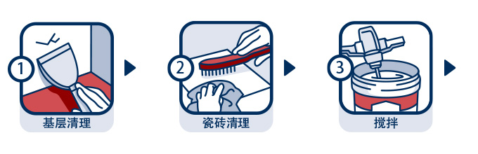 施工事項: | 瓷磚背面應(yīng)干燥且無浮灰。在開放時間(一般為20分鐘)內(nèi)完成瓷磚的揉壓粘貼。禁止無縫貼磚,磚縫不小于2mm。建議使用齒刮刀在基層與瓷磚背面同時薄刮瓷磚膠粘劑進(jìn)行雙面涂膠。攪拌好的膠漿須在2小時內(nèi)用完。 |