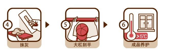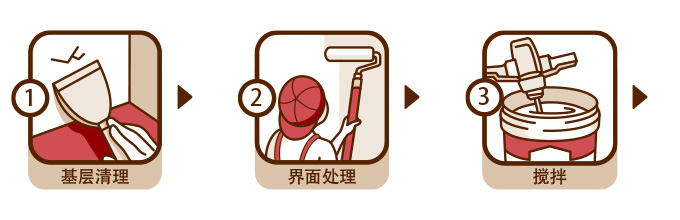 基層處理: | 基層須堅實、無明水、無浮灰與污物。上道工序留下的溝槽、孔洞等應(yīng)進(jìn)行填實修整?;鶎颖砻媸杷苫蚱交?,需用墻錮混凝土界面劑進(jìn)行界面處理或造水泥拉毛。 |